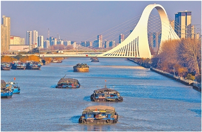京杭大运河江苏淮安段,满载物质的船舶有序漂荡。 贺敬华摄(影像中国)